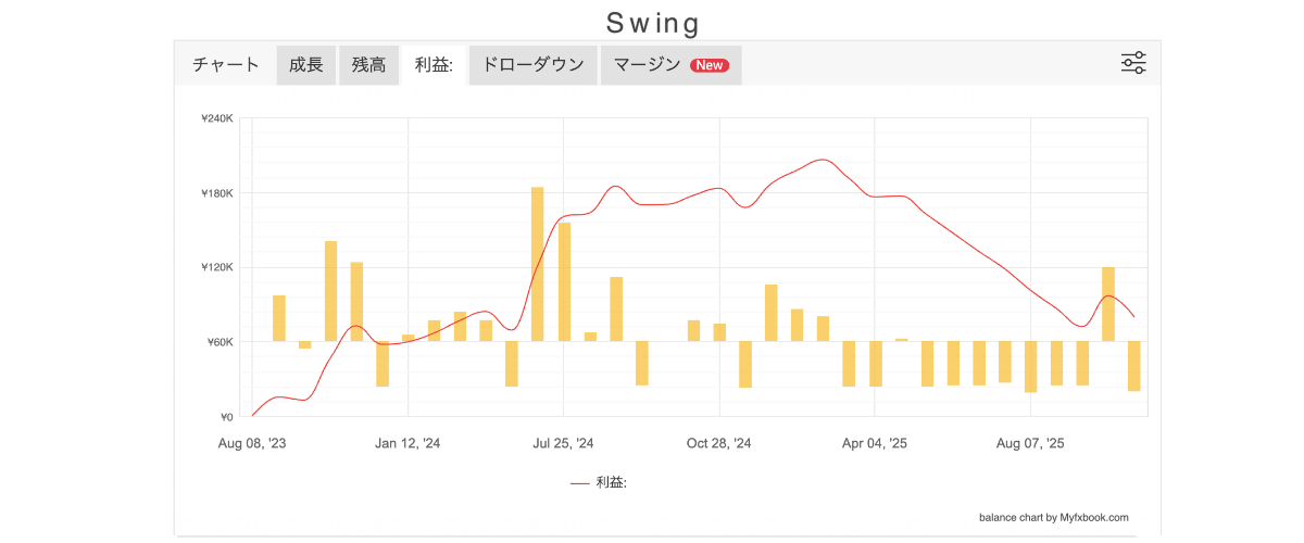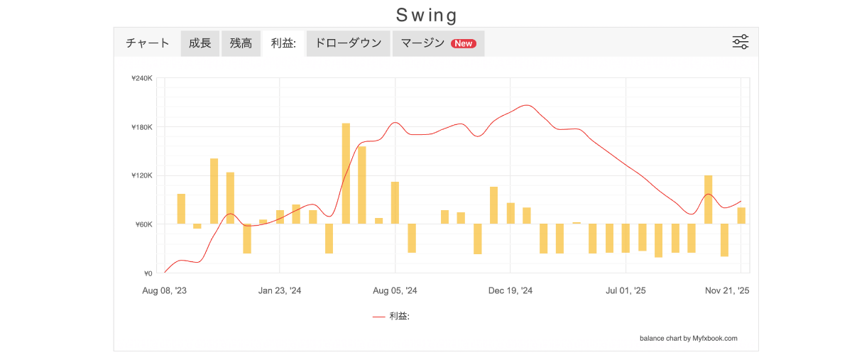 そこで次は少しだけリスクを取る代わりに、より取引数・利益ともに上がる「Swwing Highモード」での運用結果が以下になります。